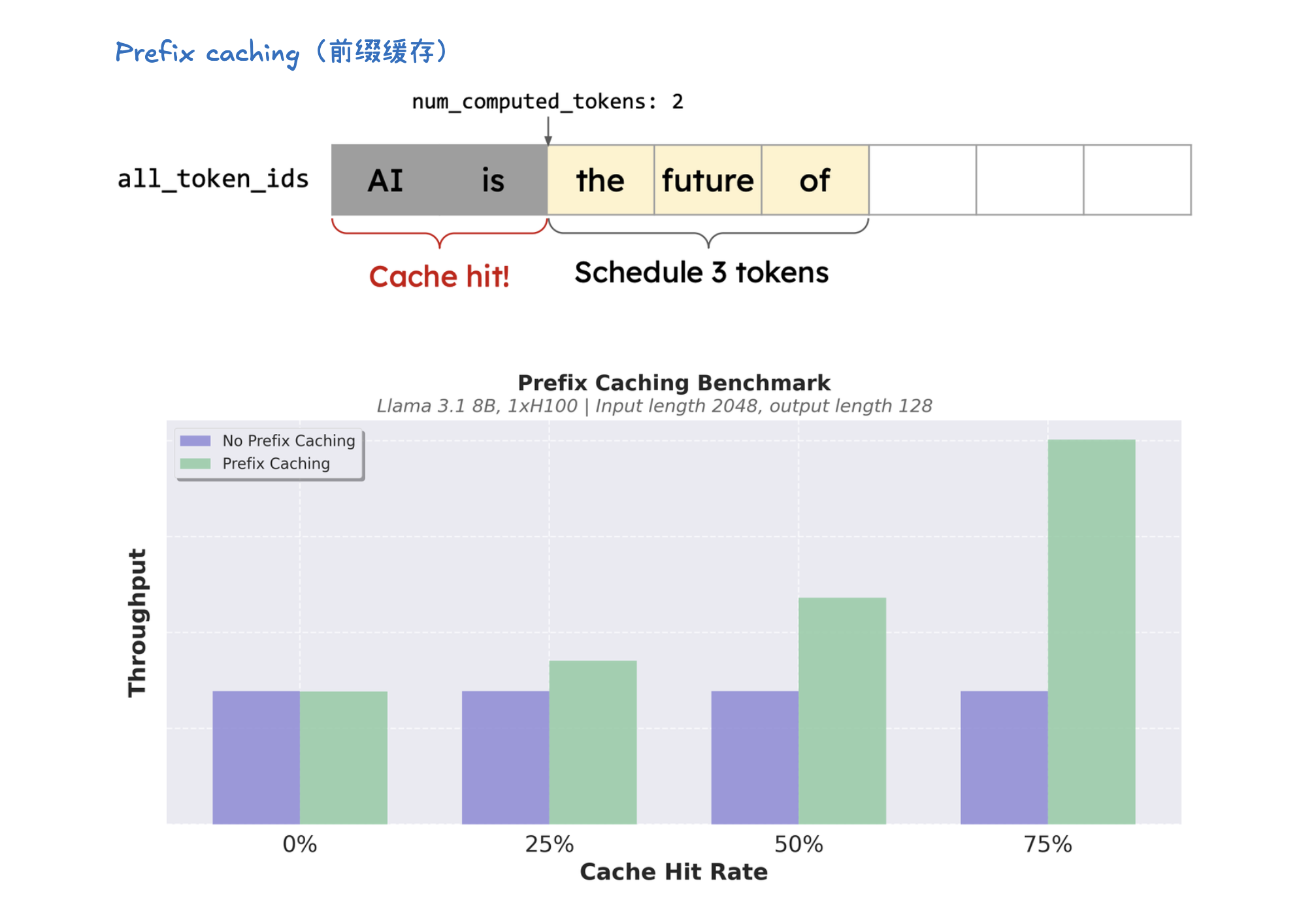 KV 缓存(KV Caching)是一种通过缓存注意力机制中的键(Key)和值(Value)向量来加速大型语言模型推理的技术。在预填充(Prefill)阶段,模型会计算并存储整个输入提示中所有 token 的 KV 缓存。这样,在后续的解码(Decode)阶段,模型就可以直接利用这些已计算好的 KV 缓存,从而避免了冗余计算并显著加速了 token 的生成过程。KV 缓存对于减少计算量、节省内存至关重要,并与前缀缓存(用于避免重复计算相同提示前缀的 KV Cache) 和分页注意力(优化 KV 缓存管理,提高内存效率)等技术协同工作。