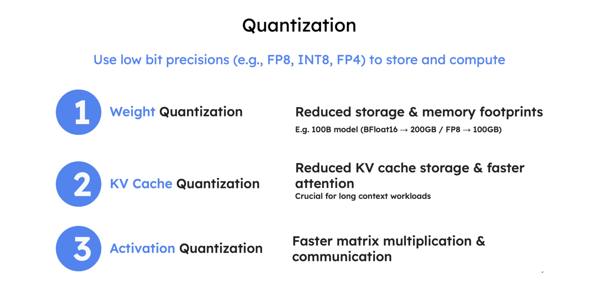 量化(Quantization)是一种通过使用低位精度(如 FP8、INT8、FP4)来存储和计算大型语言模型参数和激活值的方法。其主要目标是降低存储和内存占用,例如将 100B 模型从 BFloadt16 的 200GB 减少到 FP8 的 100GB。量化通过减少 HBM 到 SRAM 的数据传输,并利用具有更高 FLOPS 的 Tensor Core,显著加速计算密集型(预填充和大批处理解码)和内存带宽密集型(小批处理解码)两种情况。具体方法包括仅权重量子化(只量化权重)和权重+激活量子化(同时量化权重和激活值),以及对 KV 缓存进行量化以减少存储空间并加速注意力机制,这对长上下文工作负载尤为关键。最终,量化能够在固定硬件下处理更多 token,从而大幅提升吞吐量,同时通过实验验证,量化后的模型仍能保持良好的准确性和稳定性。
