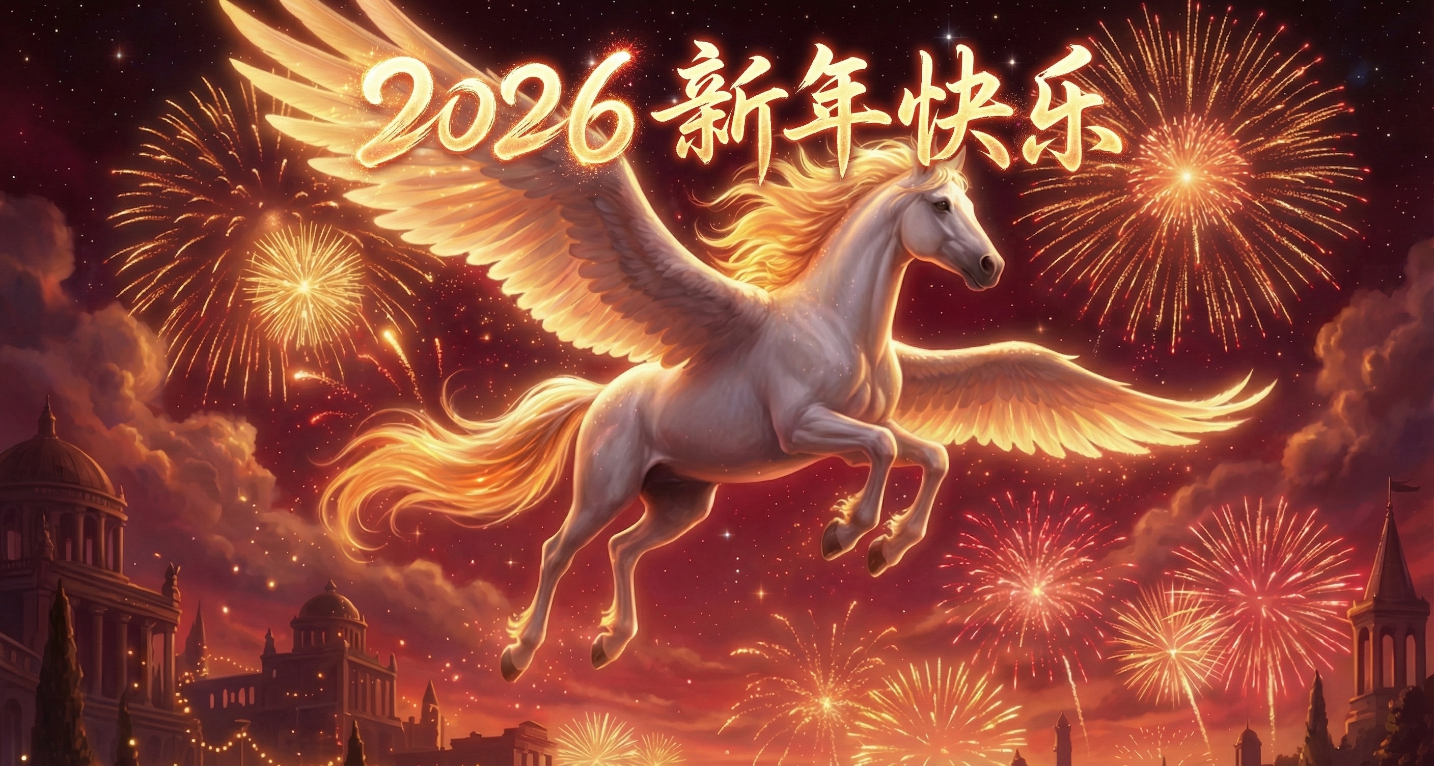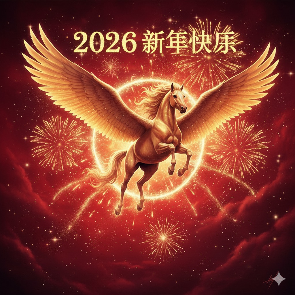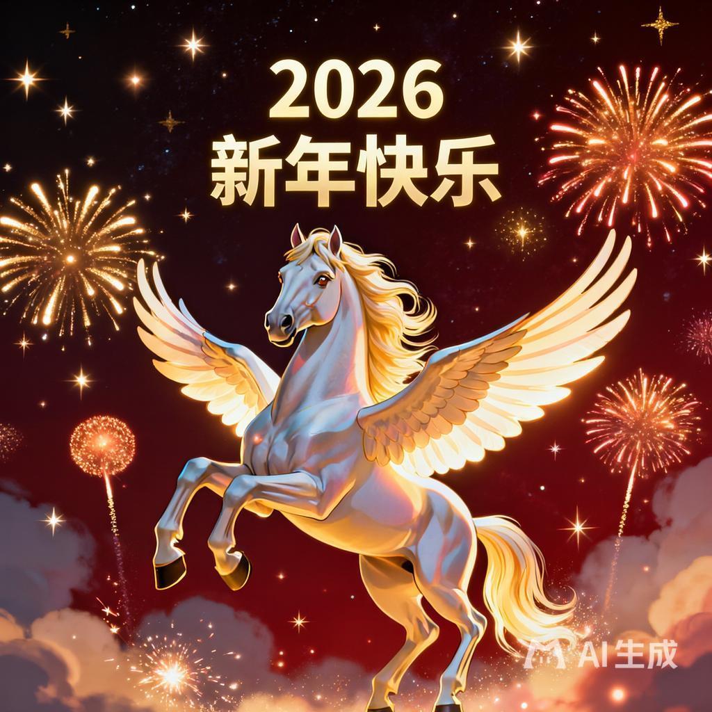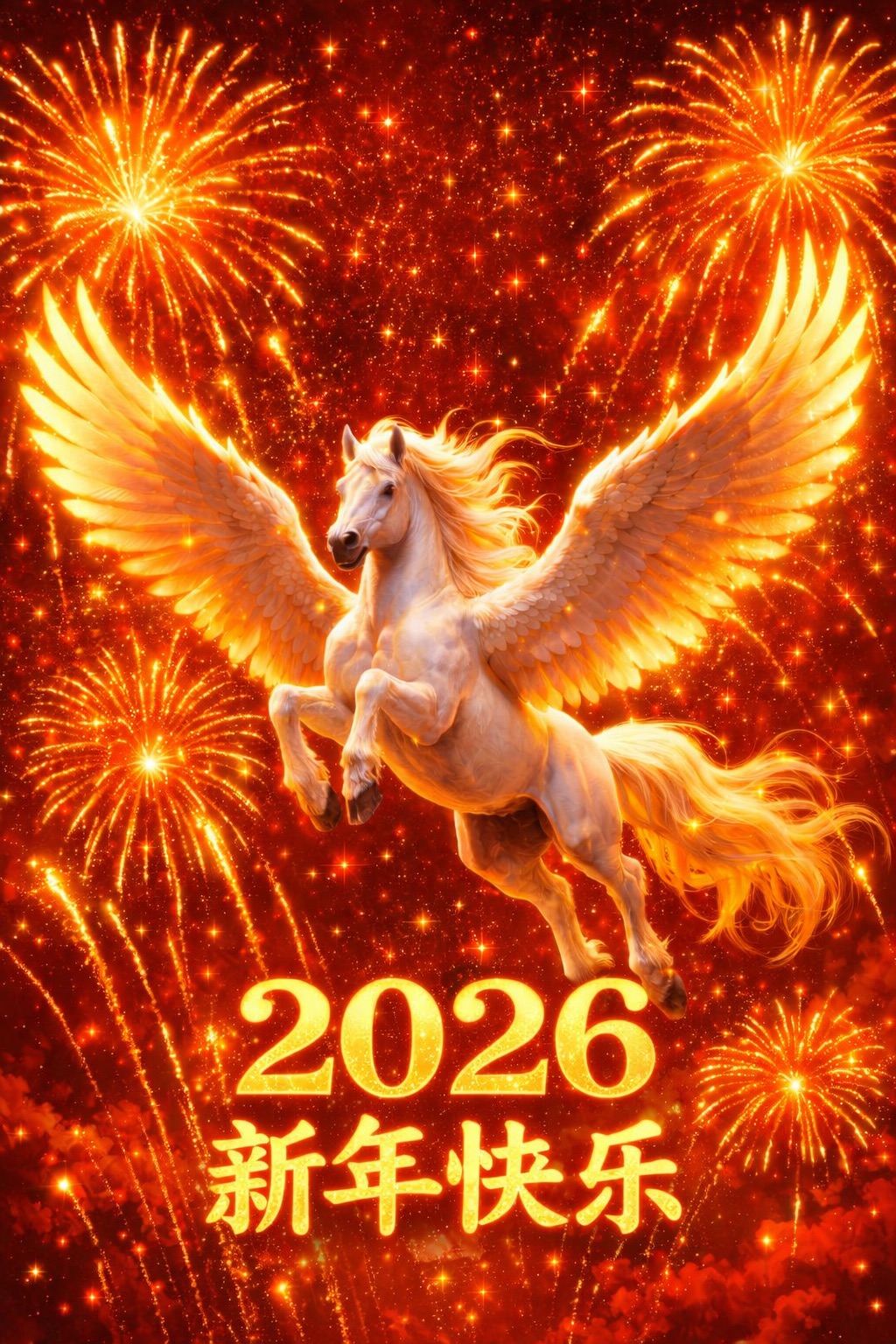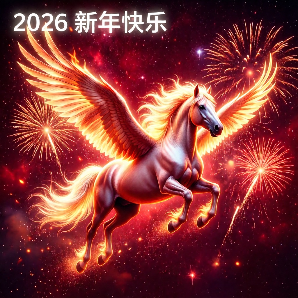 2026年新年来了,生成一张红色的飞马图像。以这个为基础写个生成图像的提示词