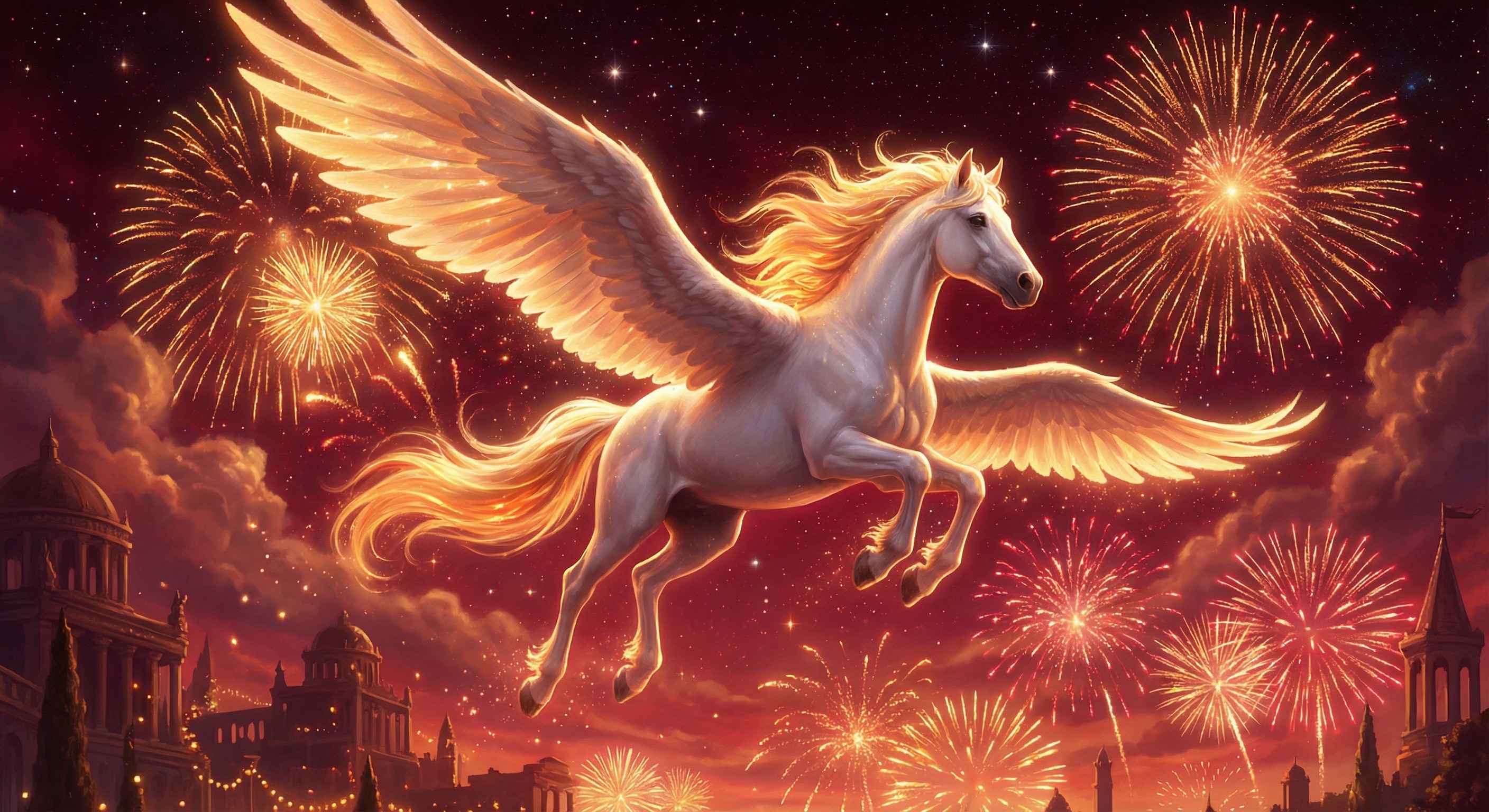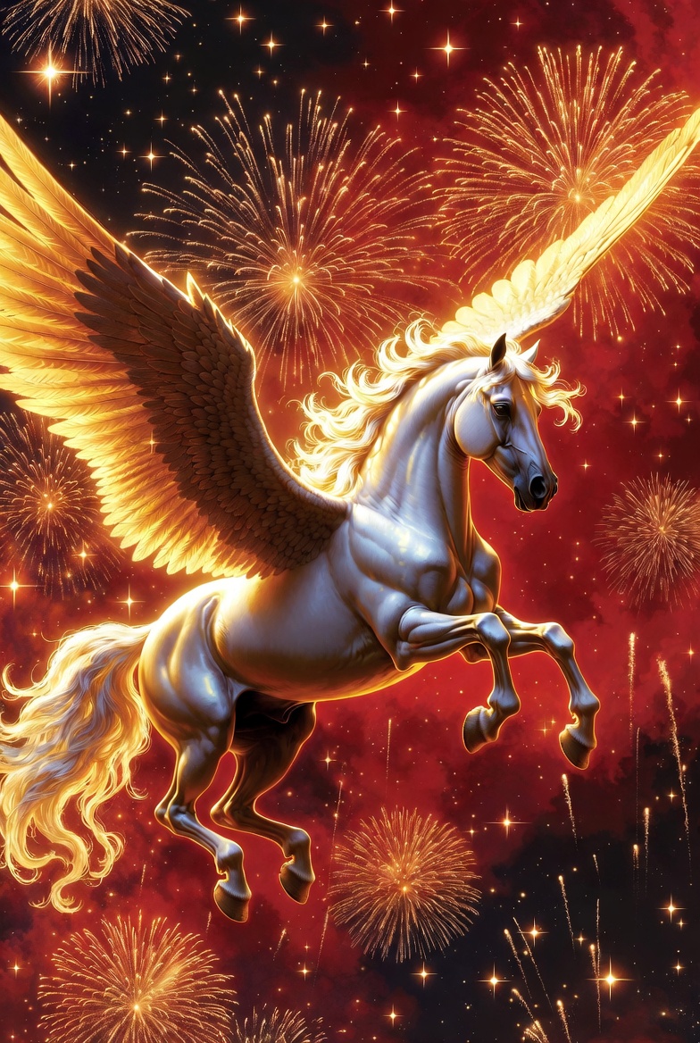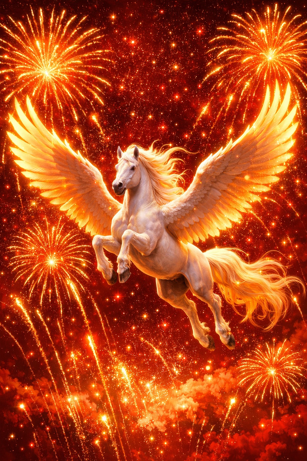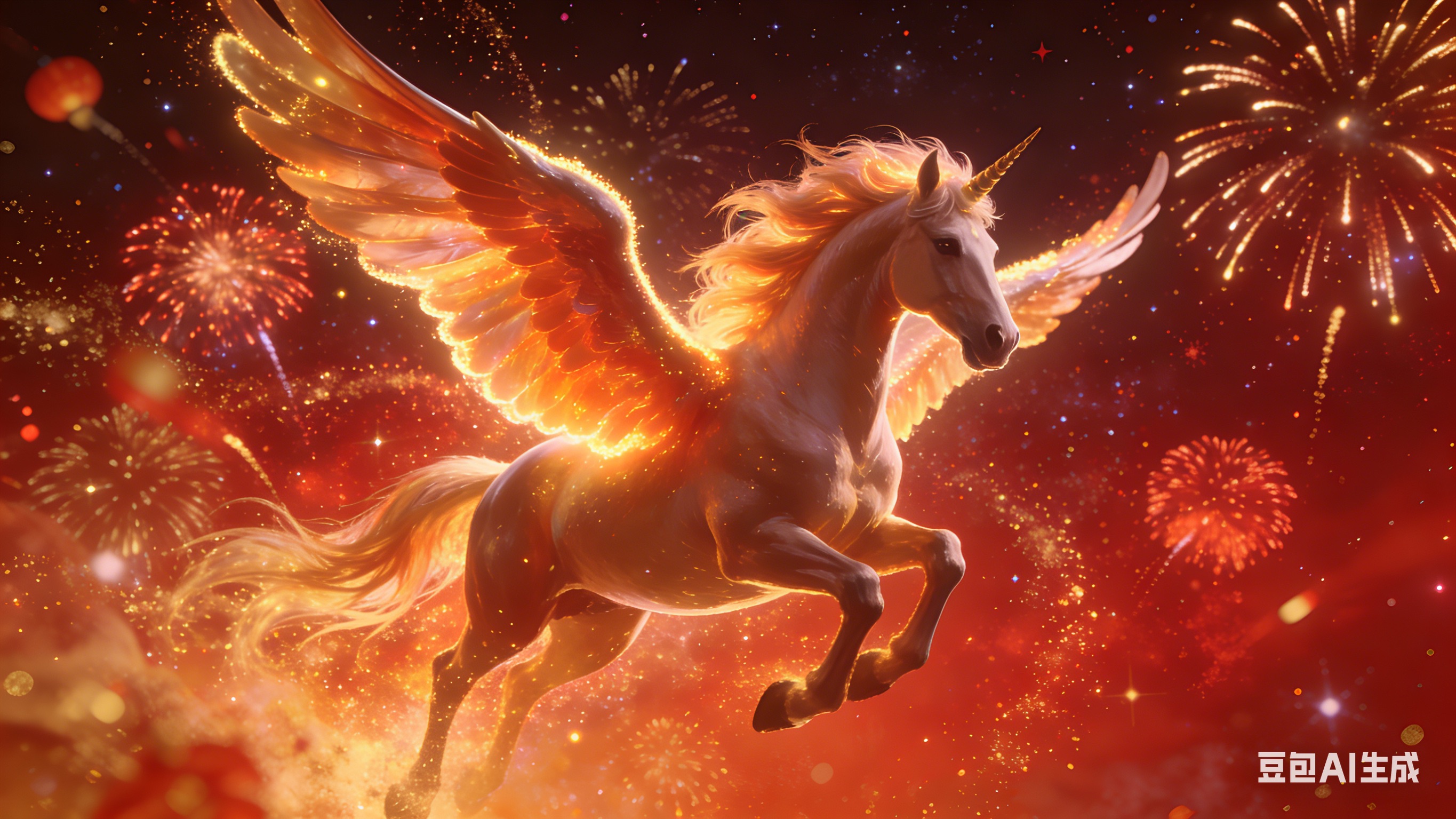 一只雄伟的飞马(天马)在绚烂的夜空中展翅翱翔,周围环绕着金色与橙红色的新年烟火,鬃毛与翅膀边缘散发柔和光芒,背景为深红色星空与闪烁的星光,风格融合奇幻艺术与节日喜庆,色彩以红色、金色为主,充满动态与希望感,4K高清,细节精致,史诗光影。