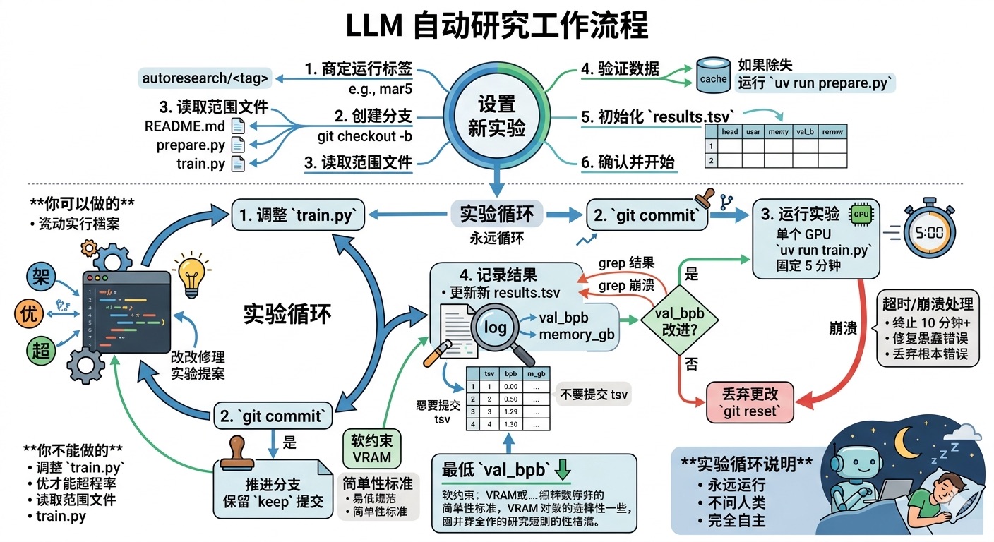 这个想法是:给一个 AI 智能体一个小但真实的 LLM 训练设置,让它在夜间自主实验。它修改代码、训练 5 分钟、检查结果是否有所改进、保留或丢弃,然后重复。你早上醒来时会看到一个实验日志,以及(希望)一个更好的模型。这里的训练代码是 nanochat 的简化单 GPU 实现。核心思想是,你不需要像研究人员通常那样触碰任何 Python 文件。相反,你是在编写 program.md Markdown 文件,这些文件为 AI 智能体提供上下文并设置你的自主研究组织。这个仓库中的默认 program.md 有意保持为一个简单的基线,不过很明显,人们会如何随着时间迭代它,以找到实现最快研究进展的”研究组织代码”,以及如何添加更多智能体等等。关于这个项目的更多背景信息,请参阅这条 推文 和 这条推文。