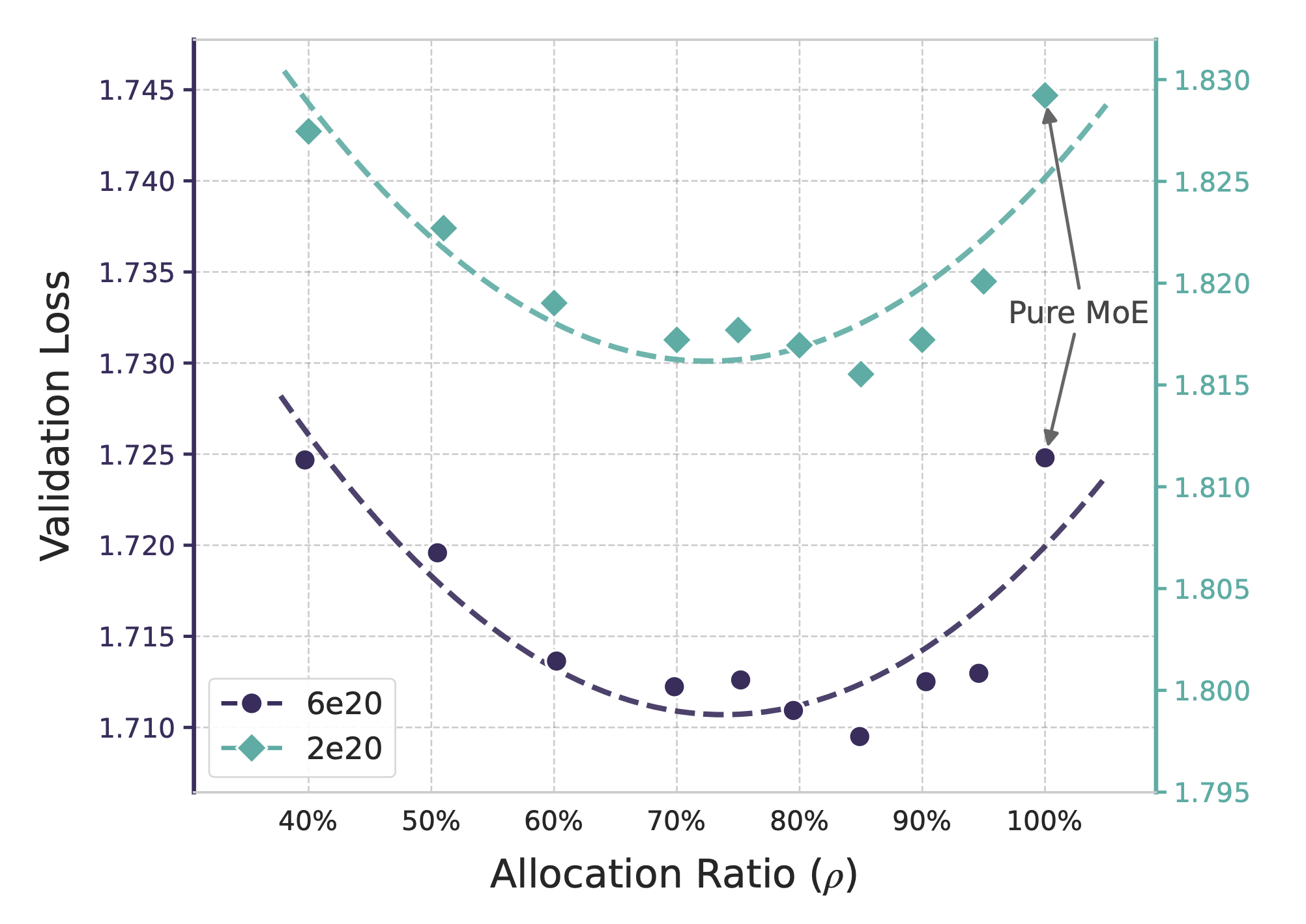 不同分配比例 ρ 下的验证集损失。图中展示了两种计算预算($2 \times 10^{20}$ 和 $6 \times 10^{20}$ FLOPs)。两种情况均呈现出 U 型曲线,其中混合分配的效果优于纯 MoE(混合专家模型)。