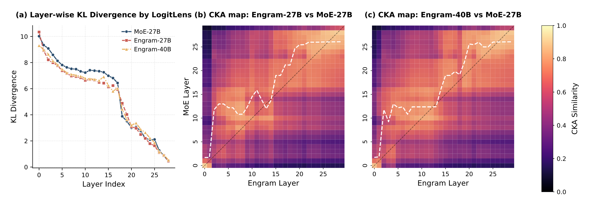- (b-c) 通过 CKA(中心化核对齐)计算的相似度热图。高相似度对角线明显的向上偏移表明,Engram 的浅层在功能上等同于 MoE 模型的更深层,从而有效地增加了模型的深度。