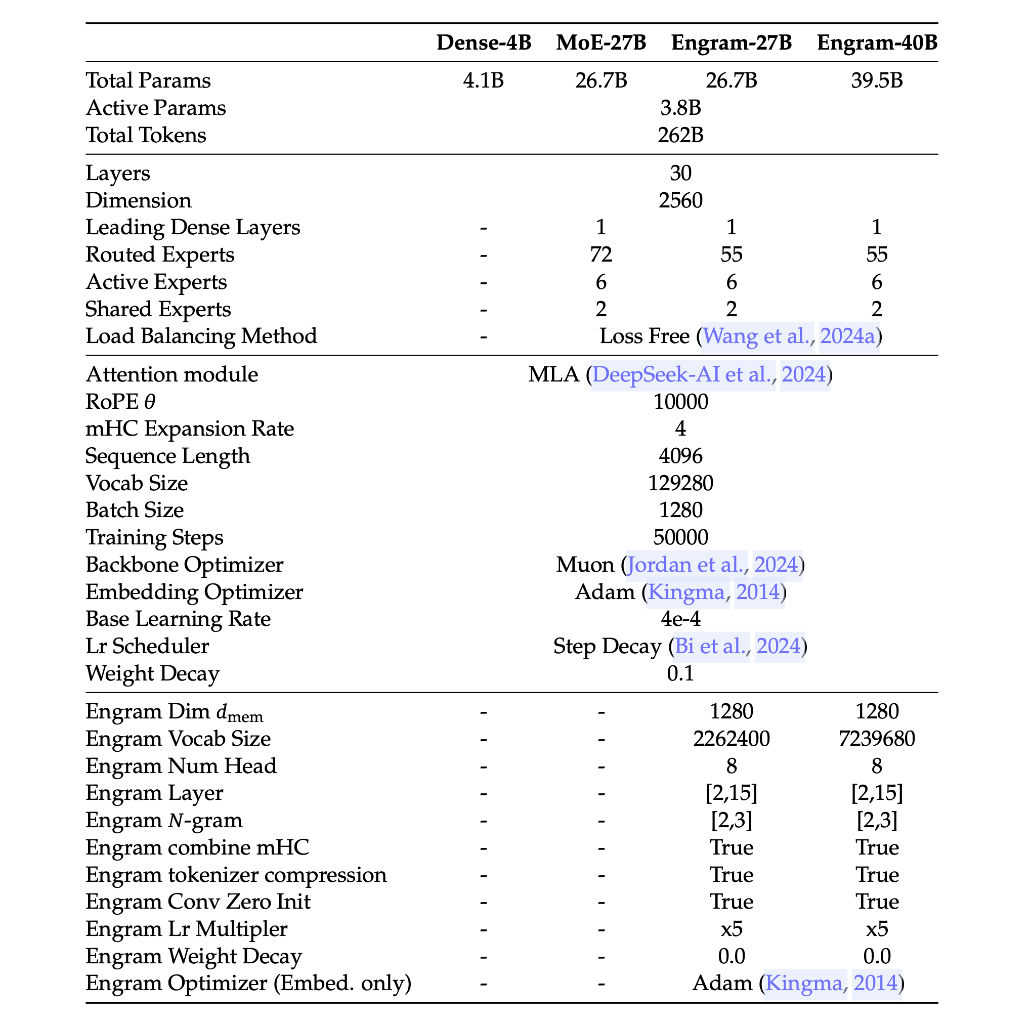 所有模型均经过 262B(2620 亿)token 的训练,且激活参数量(3.8B)保持一致。Engram-27B 通过将路由专家(routed experts)的参数进行重新分配(数量从 72 个减少到 55 个)并转入一个 5.7B 参数的 Engram 内存模块,从而实现了与 MoE-27B 的等参数量对标。Engram-40B 则在保持激活参数预算不变的情况下,进一步增加了 Engram 内存(达到 18.5B 参数)。
