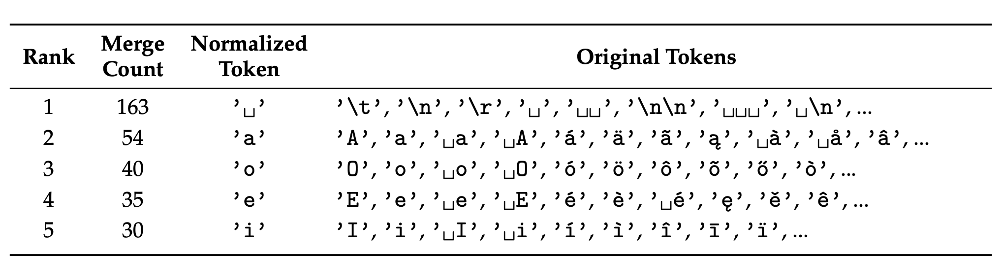 该表展示了通过分词器压缩合并出的前 5 个 token;对于我们的 128k 分词器,其整体压缩率为 23.43%。