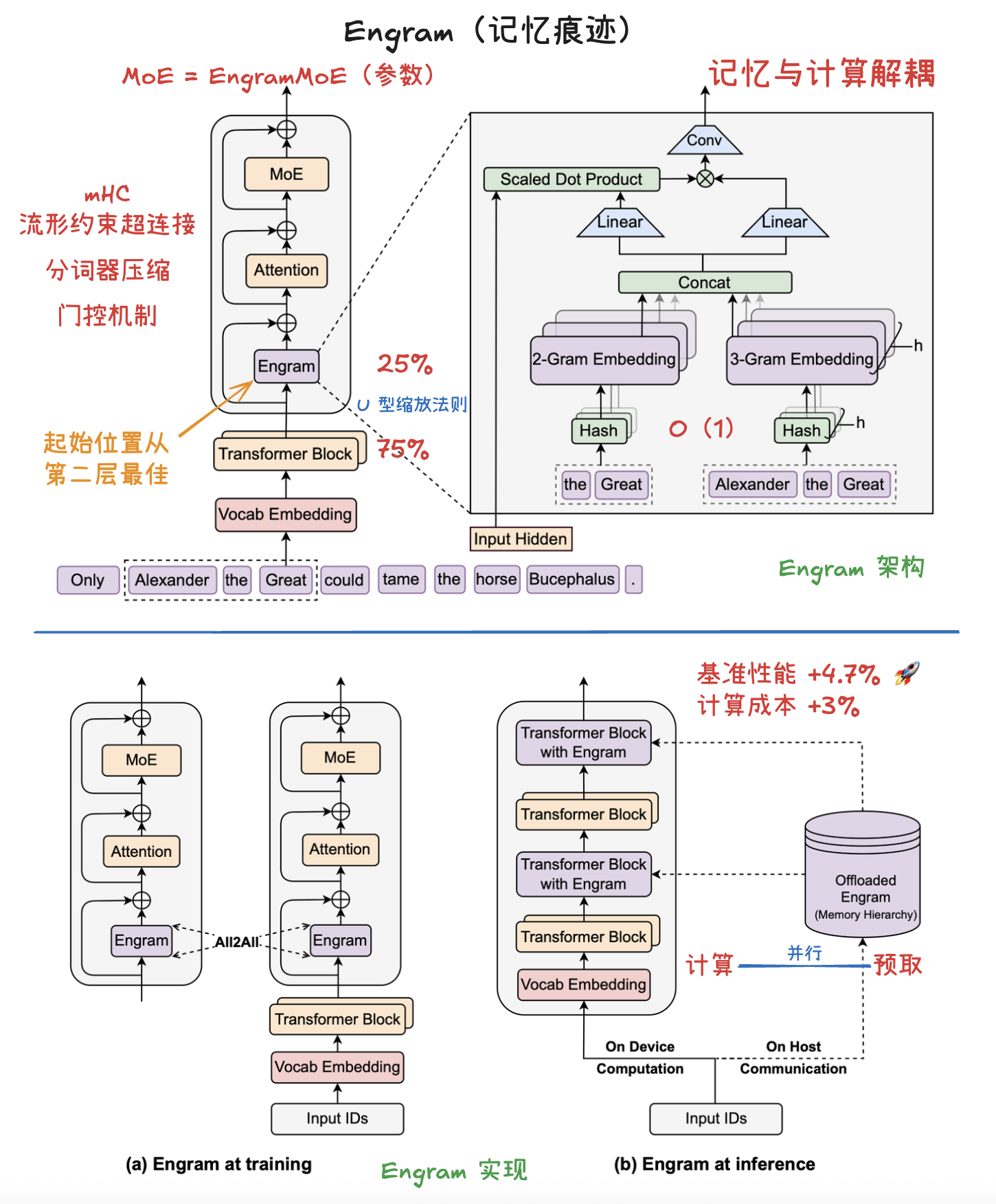 N-gram的访问频率符合齐夫定律(极少数模式占据绝大多数访问),Engram 支持多级缓存层次结构(Multi-Level Cache Hierarchy)。高频模式缓存在 GPU HBM 或主机内存中,长尾稀疏模式则可存放于 SSD,从而以极低延迟支持海量参数扩张。 - 异步预取 (Prefetching):与 MoE 的动态路由不同,Engram 的索引仅取决于