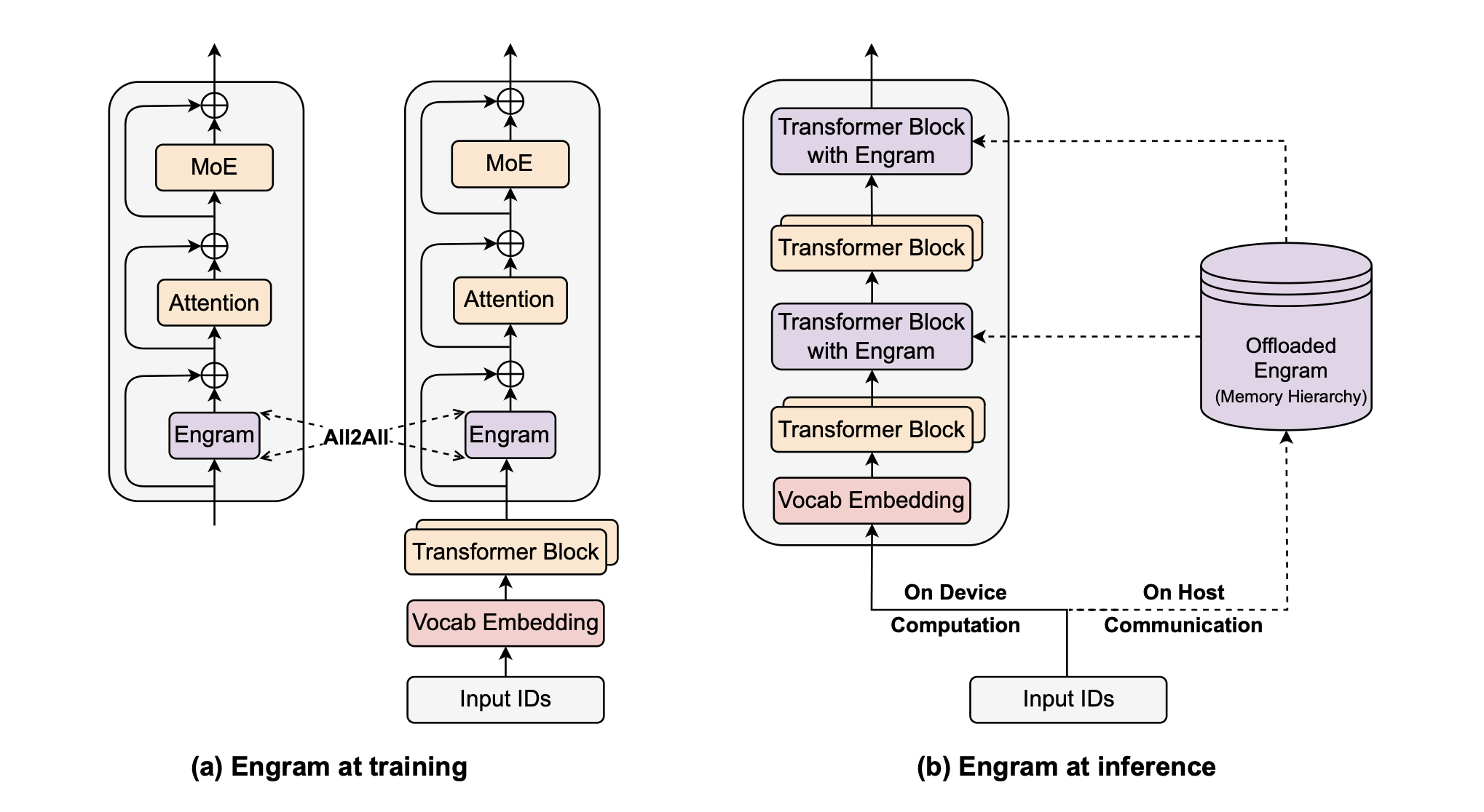- (b) 推理阶段:Engram 表被卸载(offload)到主机内存(CPU memory)中。利用确定性的检索逻辑,主机能够异步地预取并传输嵌入向量,从而使通信过程与设备上先前 Transformer 块的计算重叠(并行)。
