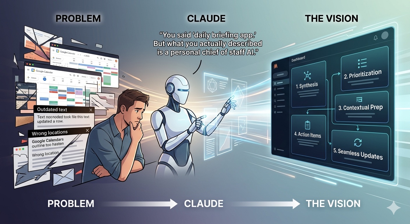 图 1:从混乱到清晰。用户(左侧)面对着多个杂乱的日历和错误的信息,感到非常沮丧。AI(Claude,中央)不仅倾听,而且主动介入,将这些碎片化的痛点合成为一个清晰的“私人幕僚长”愿景。右侧展示了重新构想后的五个核心功能模块:合成、优先级、背景准备、行动项和无缝更新。
