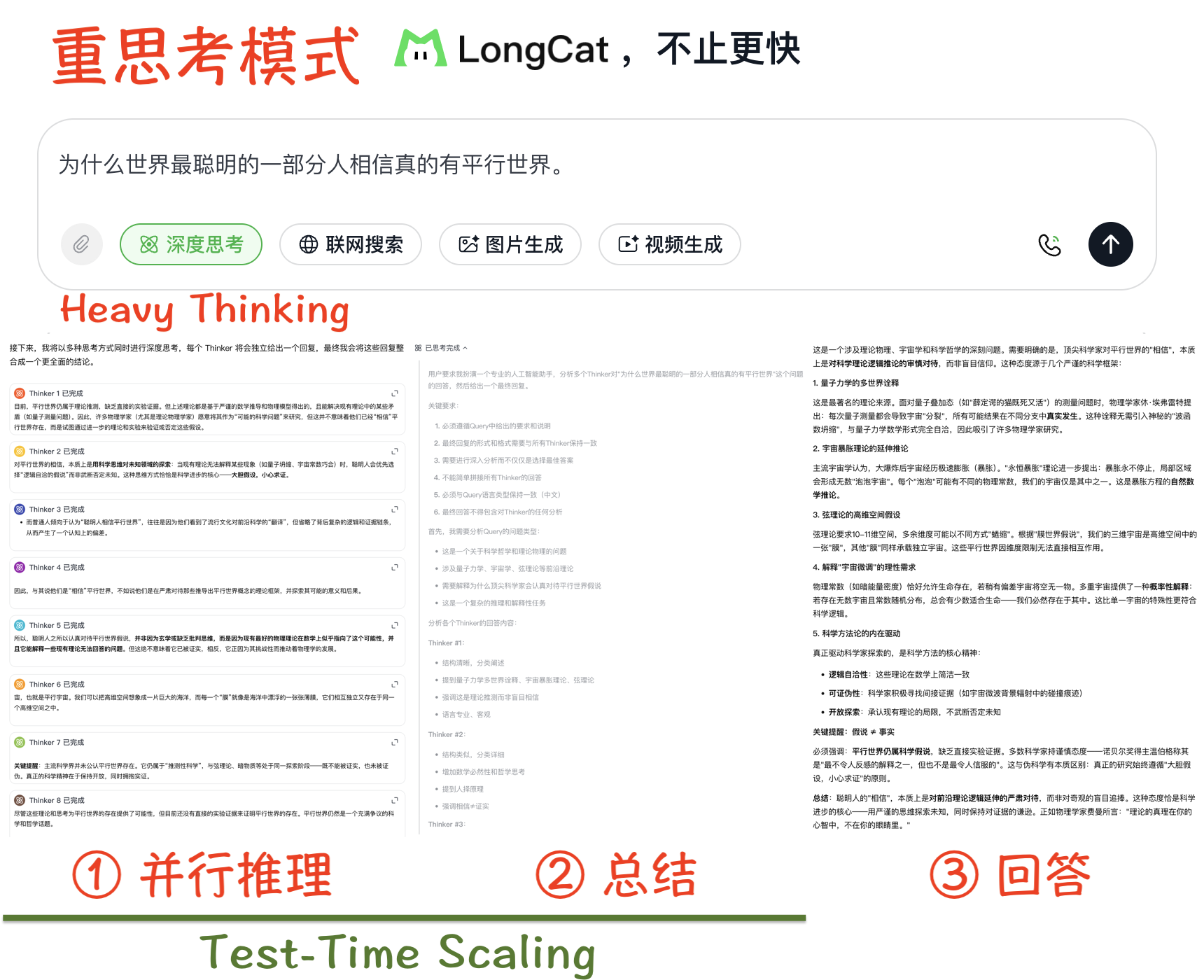 “重思考模式”(Heavy Thinking Mode)是 LongCat-Flash-Thinking-2601 模型为了突破现有推理能力极限而引入的一种推理时扩展(Test-Time Scaling)架构。该模式的核心在于通过增加推理过程中的计算量,同时在深度和宽度两个维度上扩展模型的推理能力。