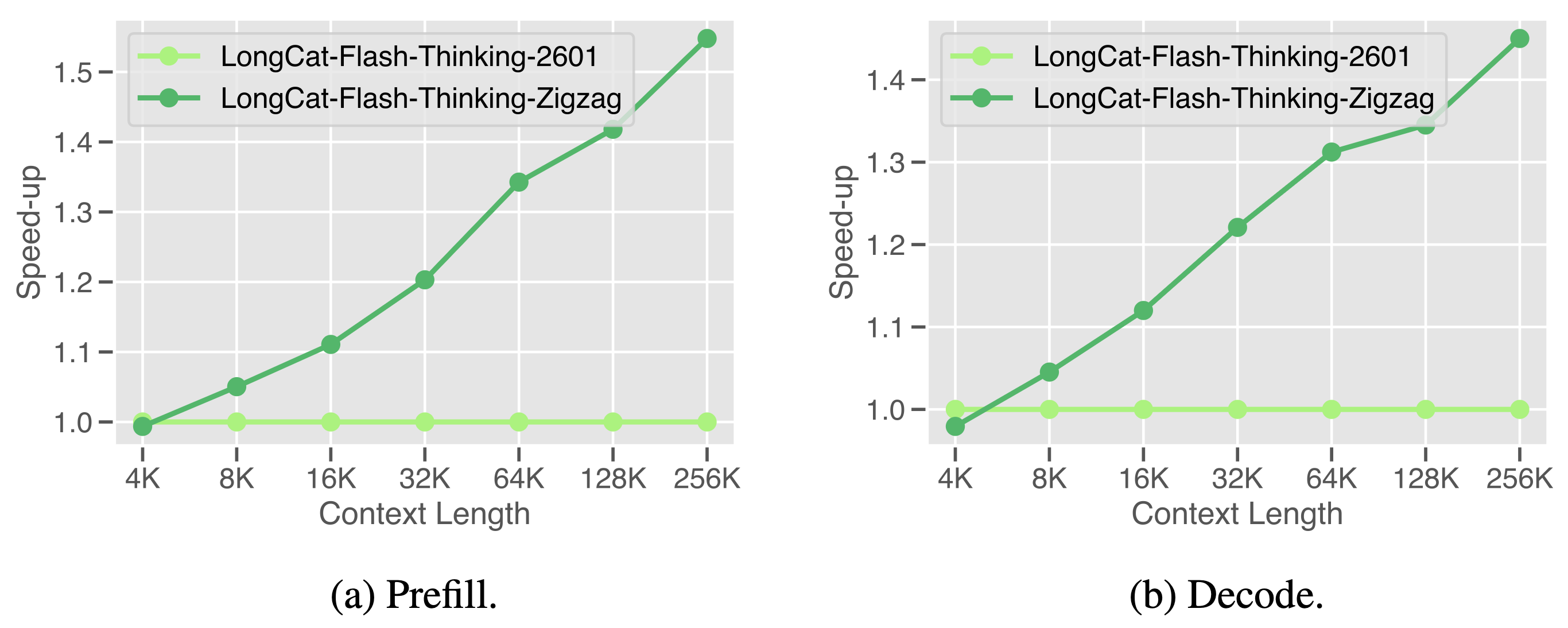 展示了 LongCat-Flash-Thinking-2601(标准全注意力模型)与 LongCat-Flash-Thinking-ZigZag(引入 Zigzag Attention 的稀疏注意力变体)在推理效率上的对比。