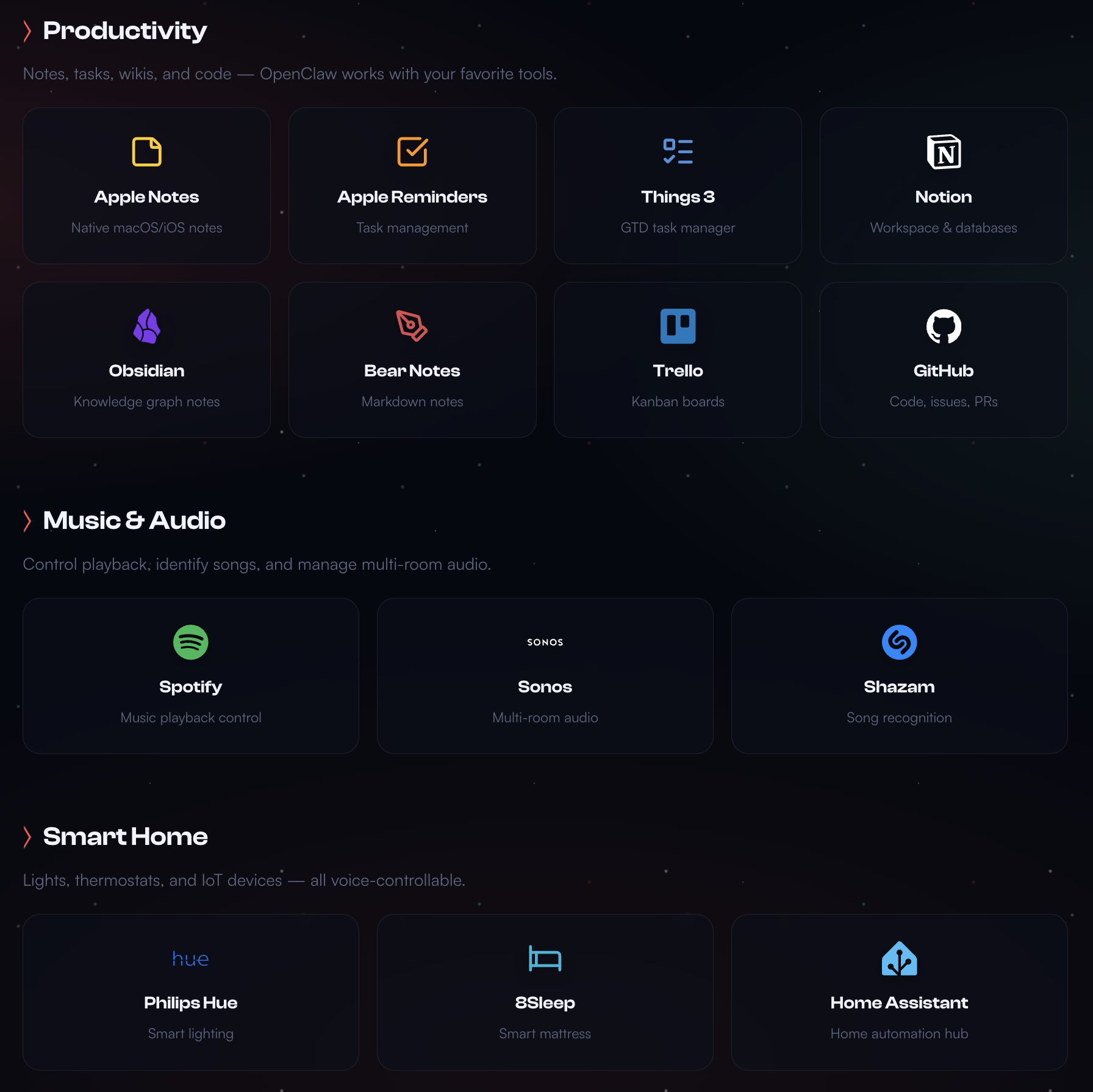 - 消息平台: 支持 WhatsApp, Telegram, Discord, 飞书等主流通讯软件,意味着用户可以在这些 App 里直接与 Agent 对话。