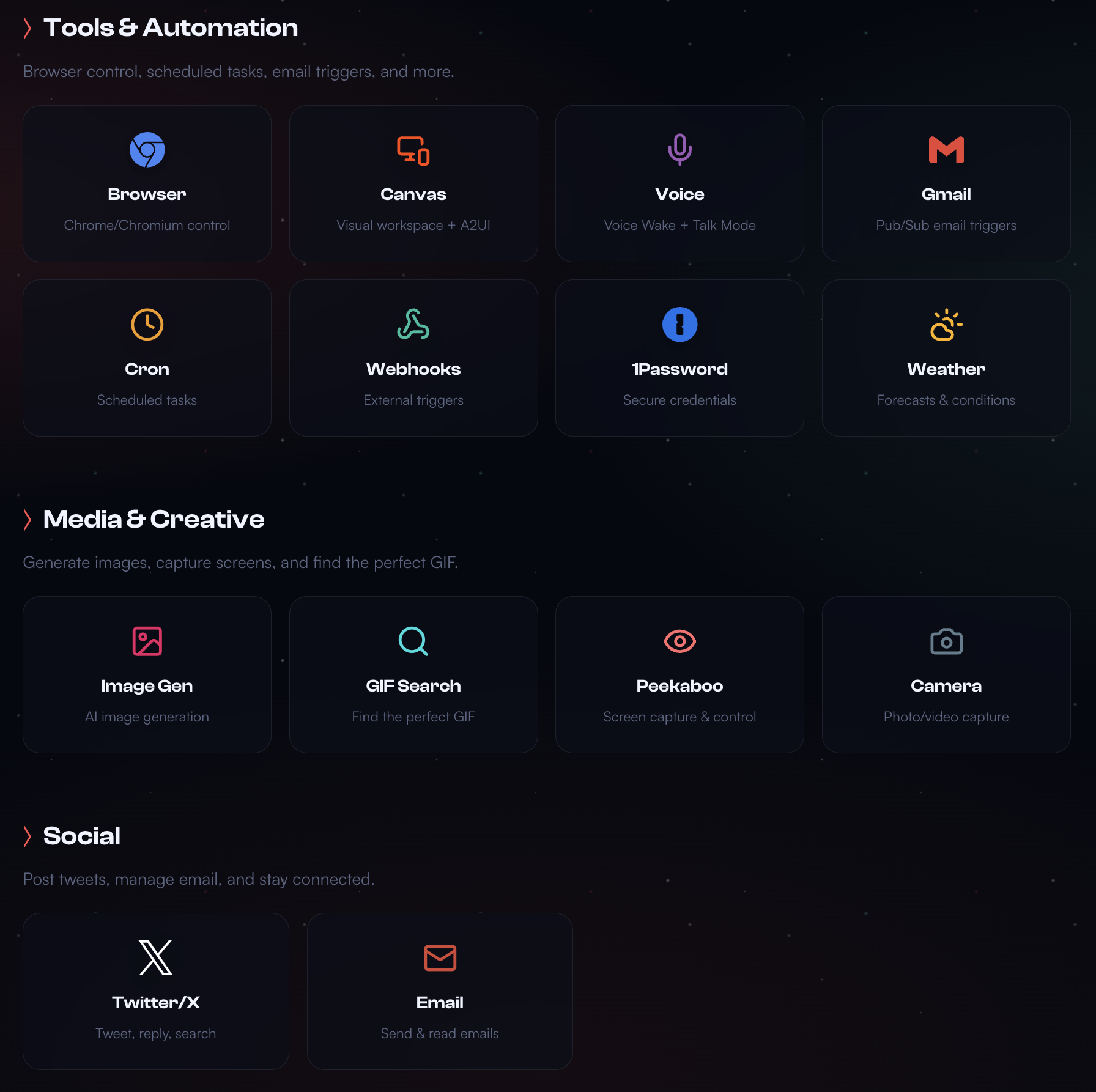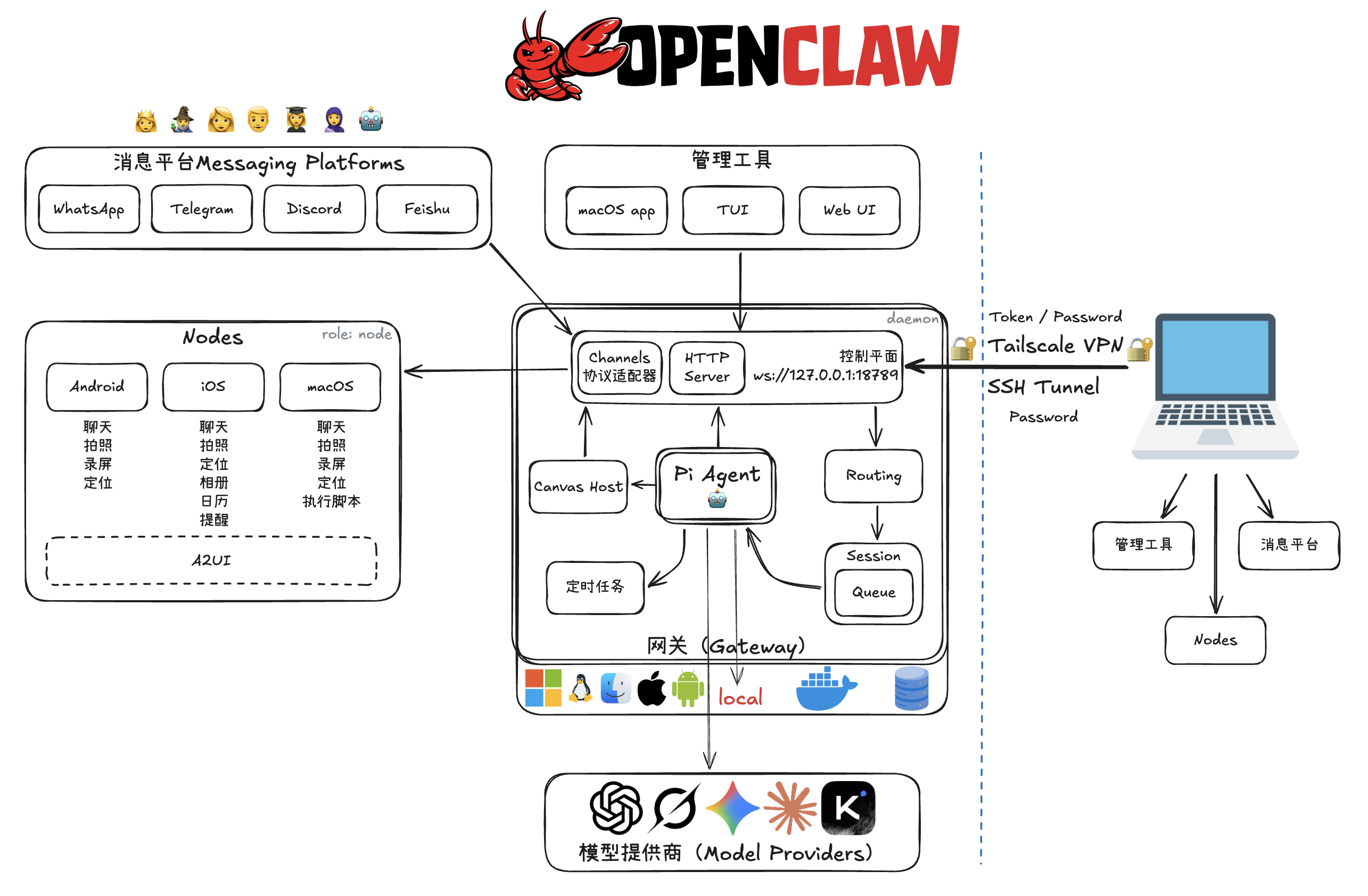 - 客户端节点 (Nodes): 覆盖 Android, iOS, macOS。这些节点不仅是聊天窗口,还能调用设备能力(如拍照、定位、录屏、执行脚本),让 AI 拥有“手”和“眼”。