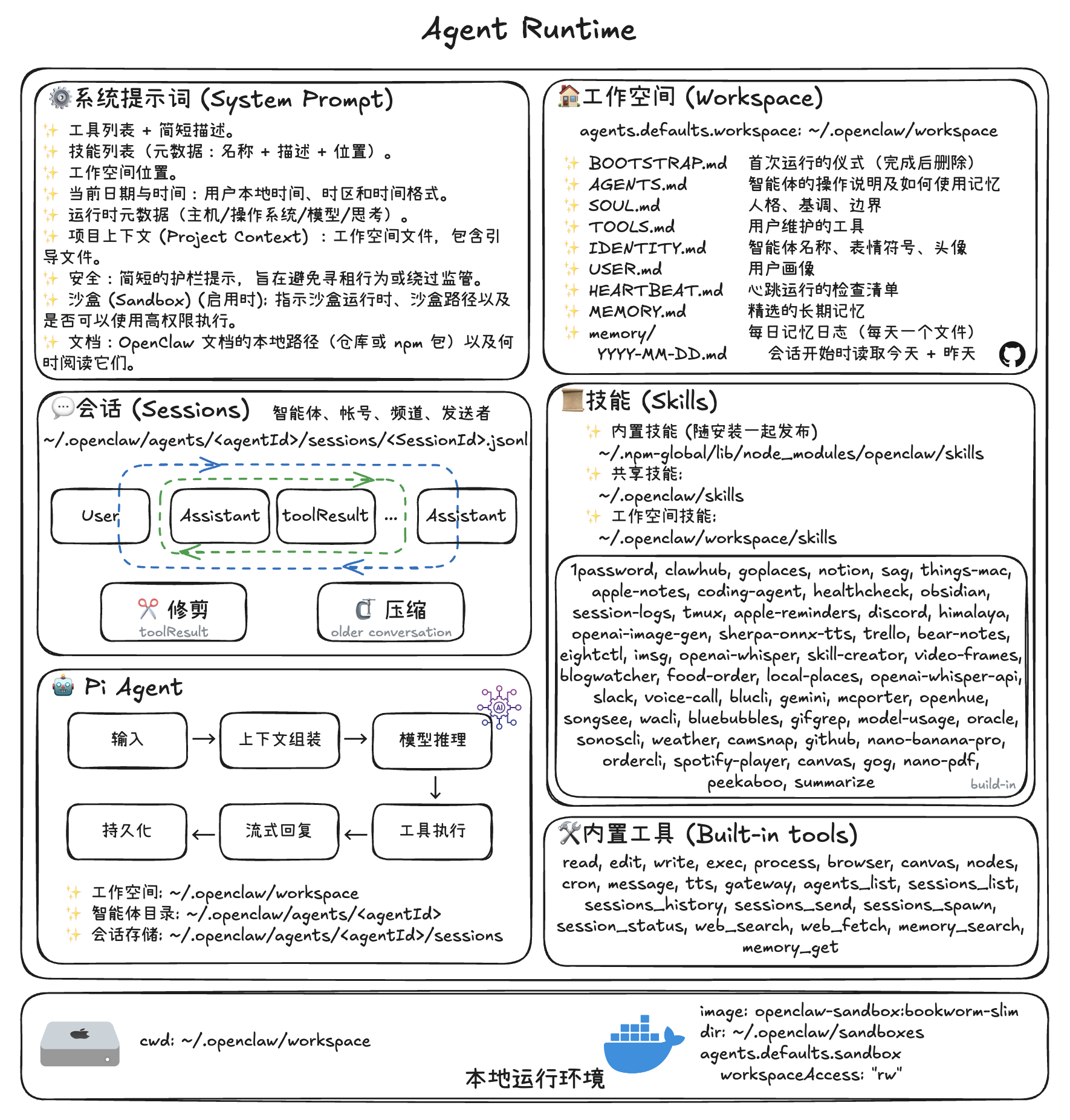 MEMORY,AGENTS):通过“每日日志”与“长期记忆”实现跨会话的知识积累,而非每次新鲜唤醒。 - 伙伴与工具 (