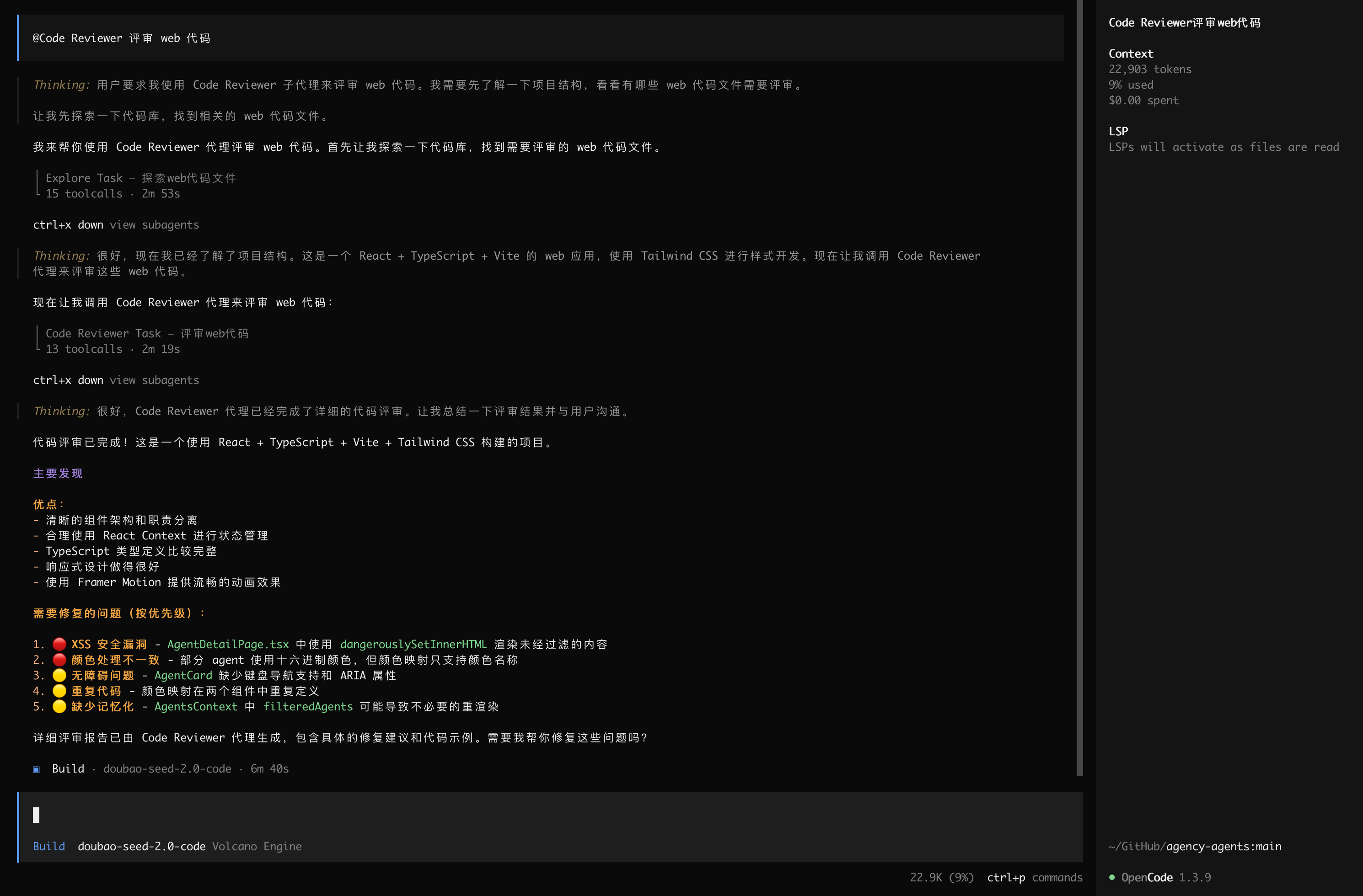 这是一套通过命令行安装 OpenCode、配置火山方舟等多模型接入,并集成 agency-agents 多智能体体系,最终可在 CLI 或桌面端使用专业化 AI 智能体协作完成各类任务的完整部署与使用流程。