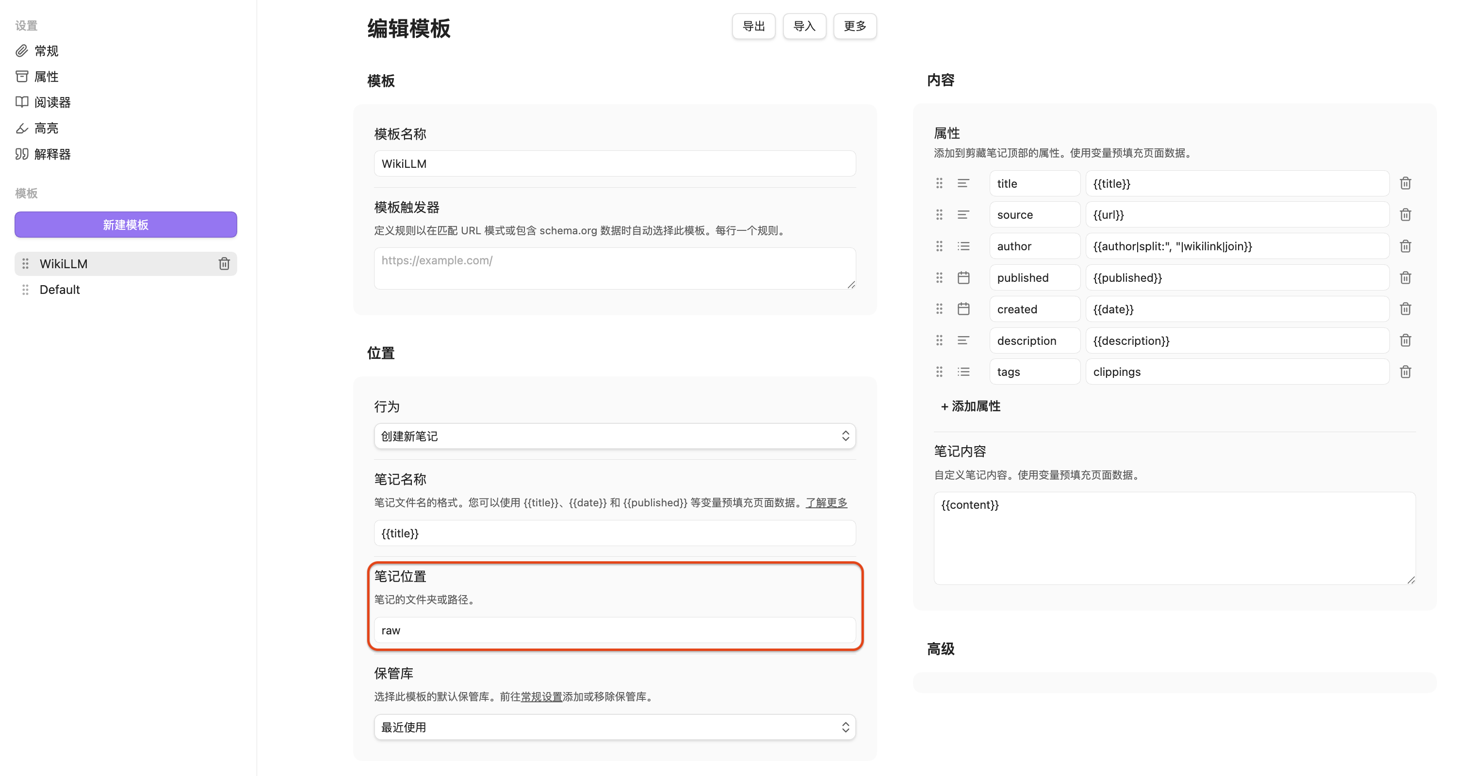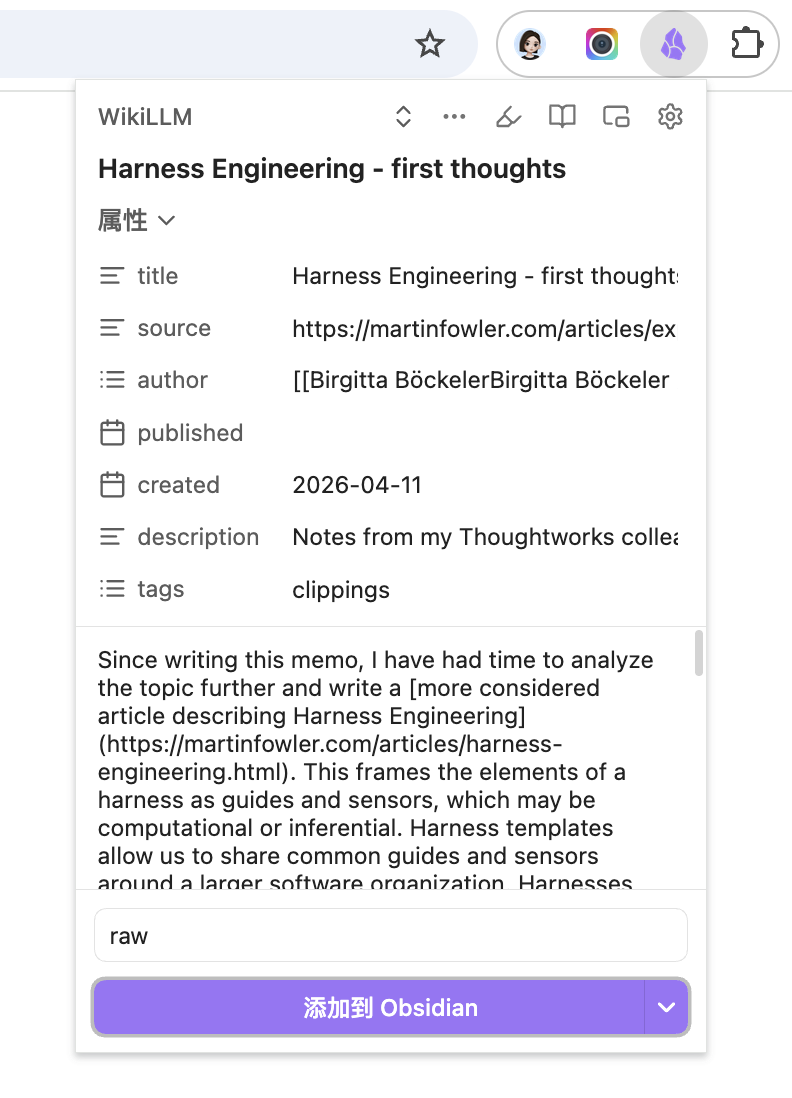 - 浏览网页,当遇到有价值的内容时,单击 Obsidian Web Clipper 图标,选择 WikiLLM 模板,添加到 Obsidian。