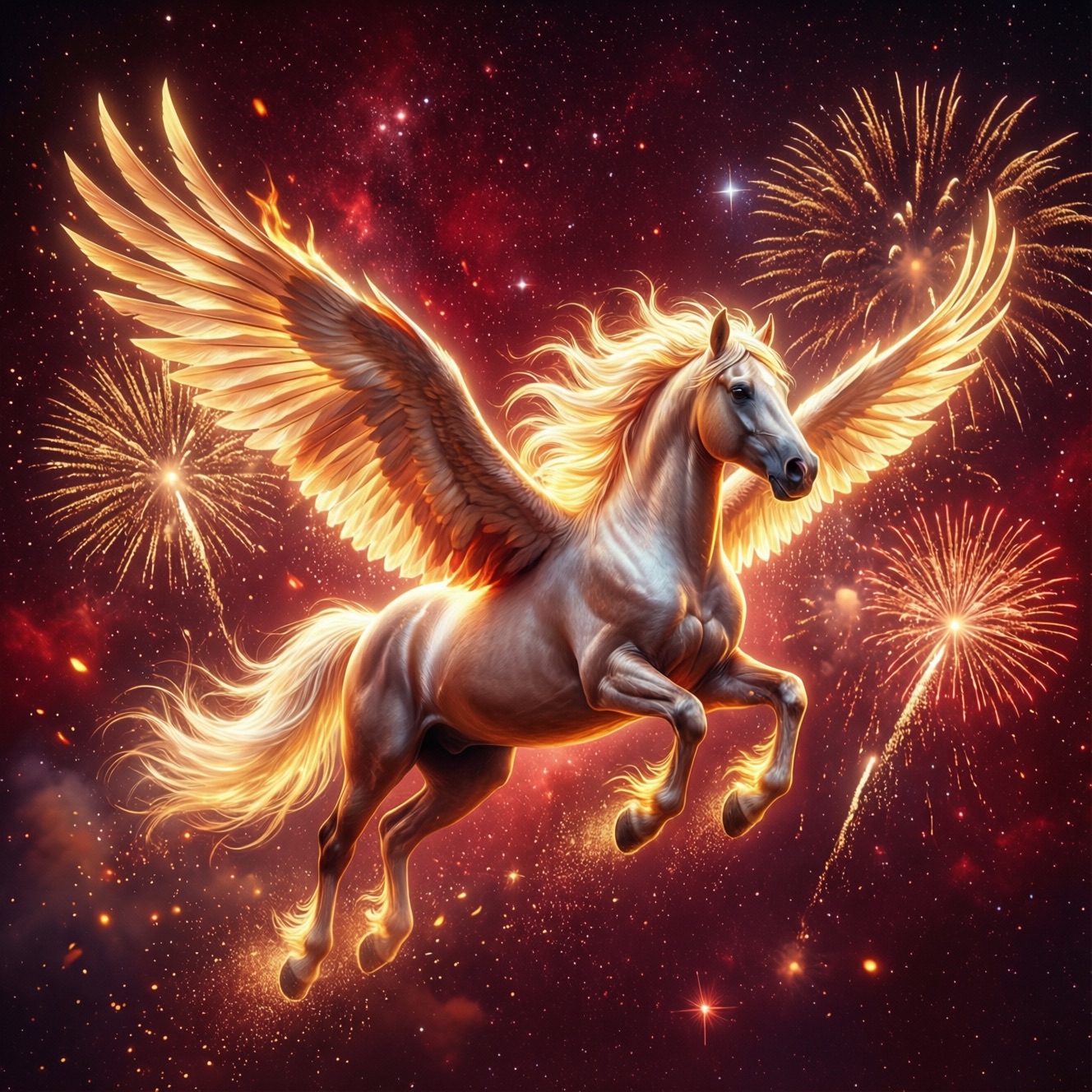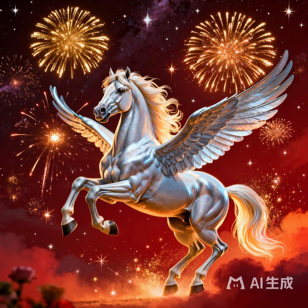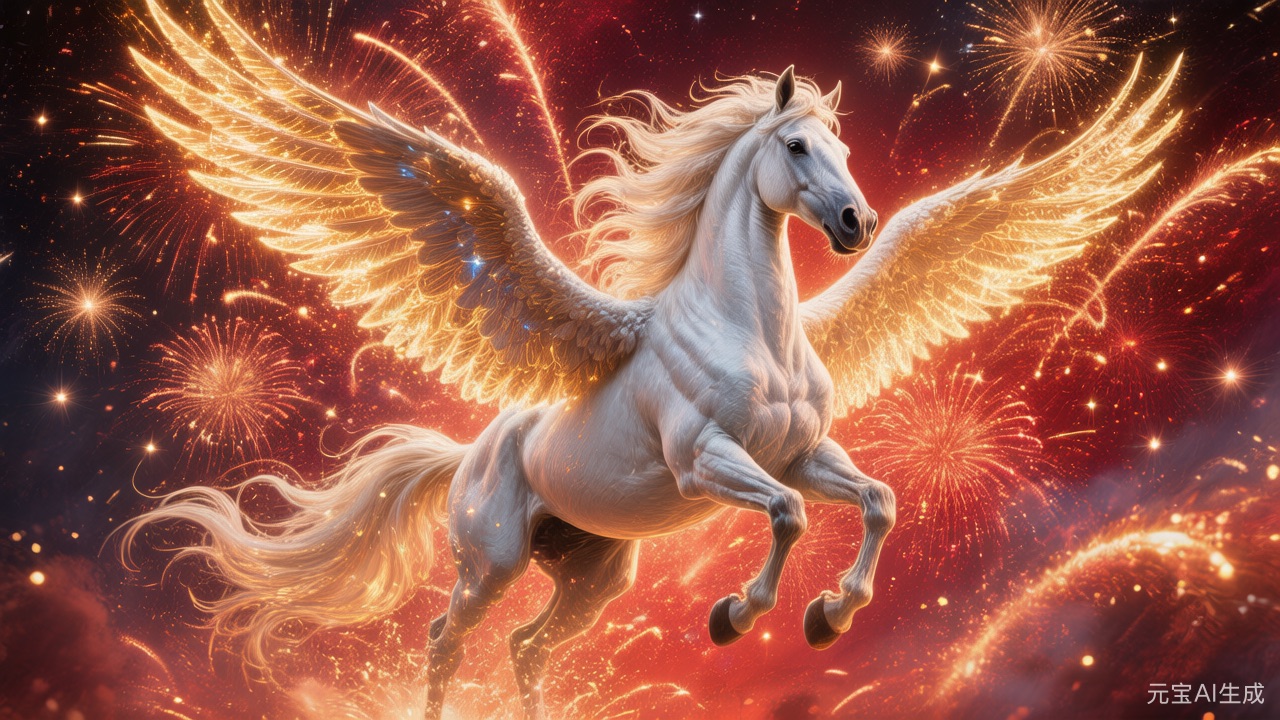 一只雄伟的飞马(天马)在绚烂的夜空中展翅翱翔,周围环绕着金色与橙红色的新年烟火,鬃毛与翅膀边缘散发柔和光芒,背景为深红色星空与闪烁的星光,风格融合奇幻艺术与节日喜庆,色彩以红色、金色为主,充满动态与希望感,4K高清,细节精致,史诗光影。