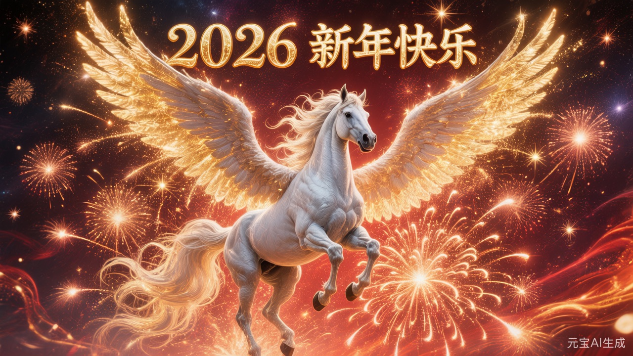 2026年新年来了,生成一张红色的飞马图像。以这个为基础写个生成图像的提示词